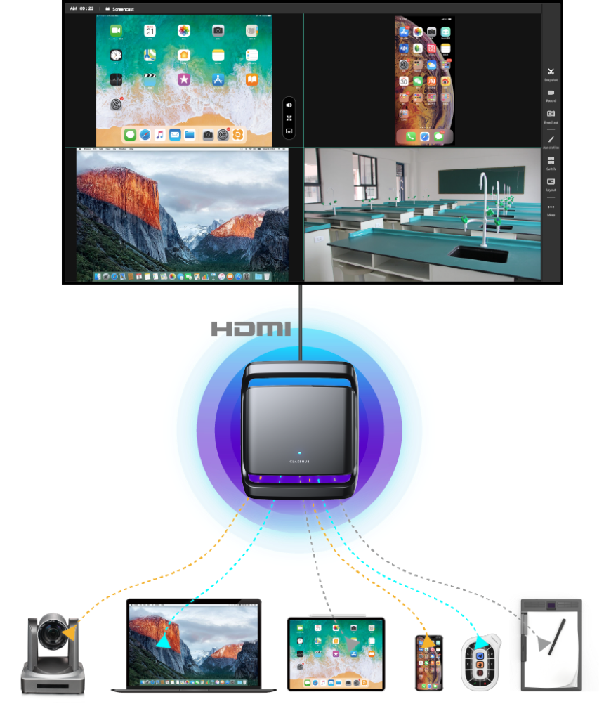 Sebagai pendatang baru keluarga MGLab, ClassHub adalah produk kolaborasi dan presentasi nirkabel all-in-one yang kuat, menampilkan presentasi nirkabel byod, pengajaran interaktif, perekaman dan penyiaran, kolaborasi jarak jauh, manajemen & kontrol, dll. MGLab ClassHub, acuan ideal dari sebuah kelas yang modern, kompatibel dengan berbagai peralatan yang sudah ada sebelumnya dengan sempurna, secara efektif mewujudkan peningkatan ruang kelas yang cerdas, dengan konsep "terkoneksi" sepenuhnya.